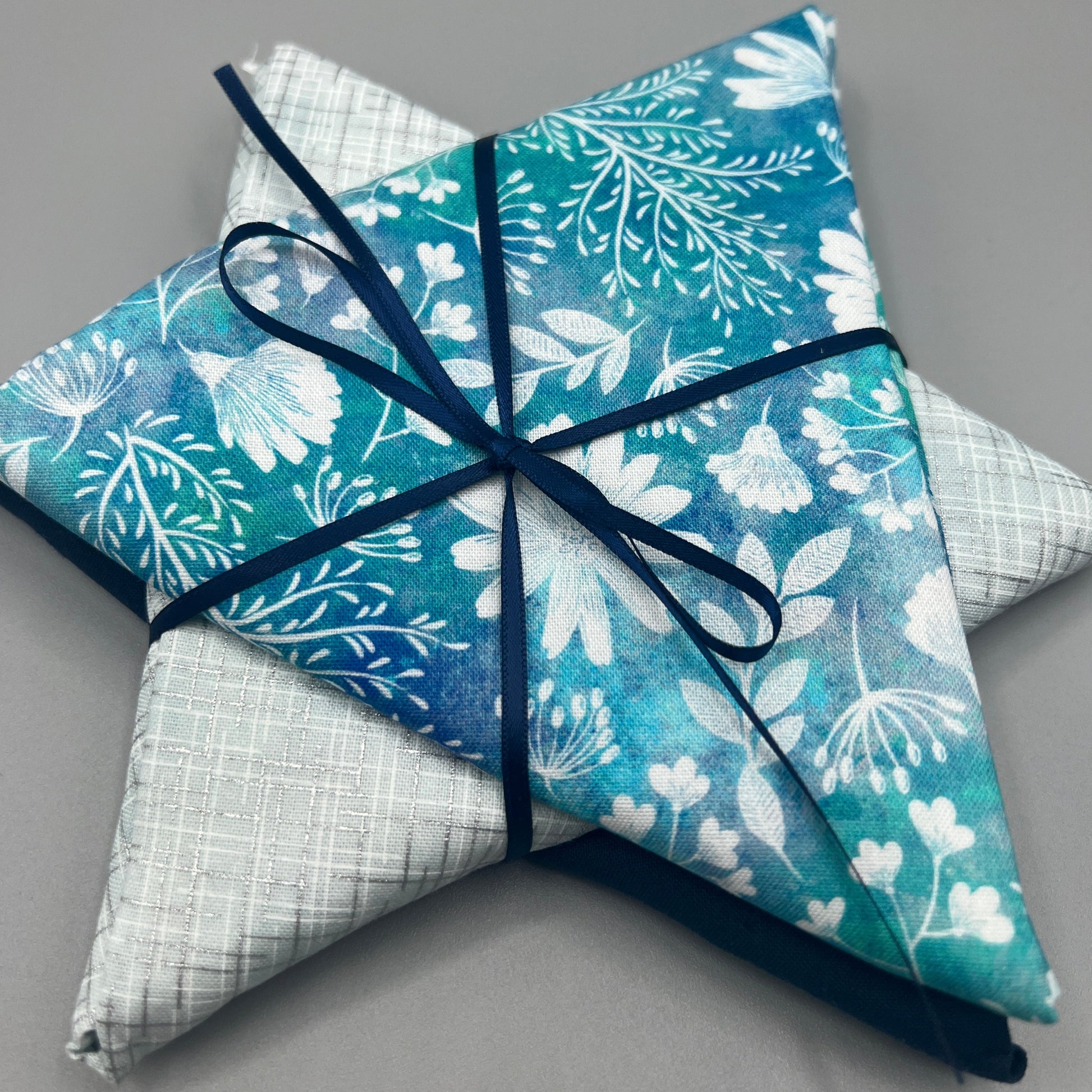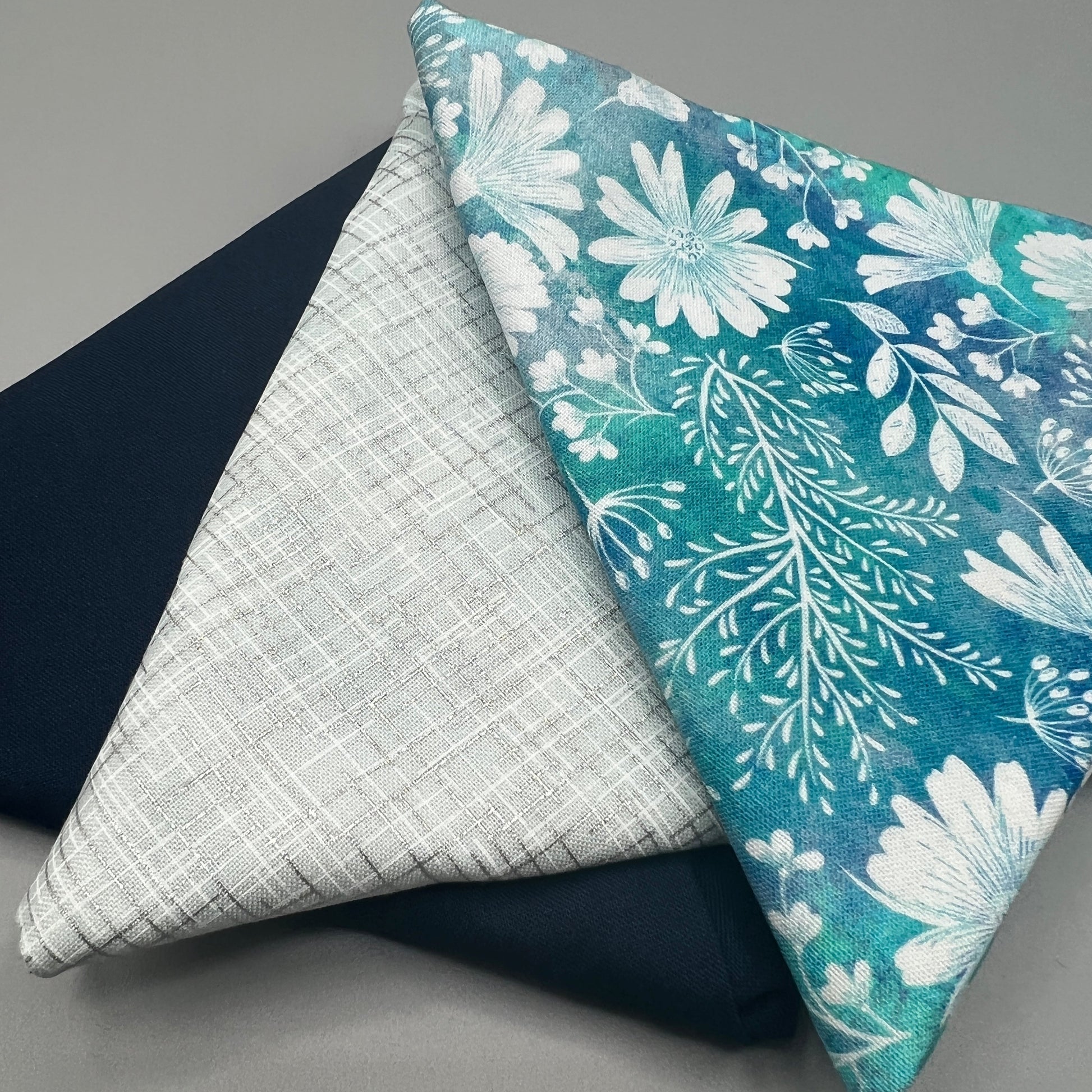 3 Piece - Curated Fat Quarter Bundle with Floral Print, Linen Look with Metallic, and Kona Navy