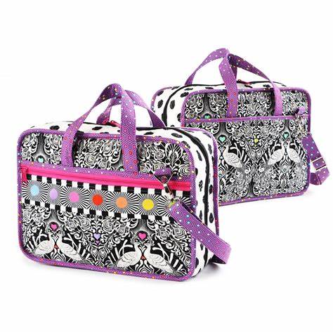 The bag features handles and an adjustable/detachable carrying strap along with two removable pocket pages with mesh or vinyl pockets in a variety of styles.