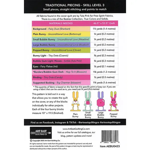 Blowing Up Bunnies - Rabbits Chewing Gum - includes complete instructions for making the 46.5” x 53.5” quilt (as seen on the cover) or individual bunny blocks for smaller projects. The individual blocks each measure 10” x 19.5” and include a plain bunny block, a bunny blowing a small bubble, a bunny blowing a large bunny and a bunny whose bubble popped all over them! This project is designed using conventional piecing techniques (no paper-piecing). A cutting guide layout diagram is included to help you make the most of your background fabric for cutting.