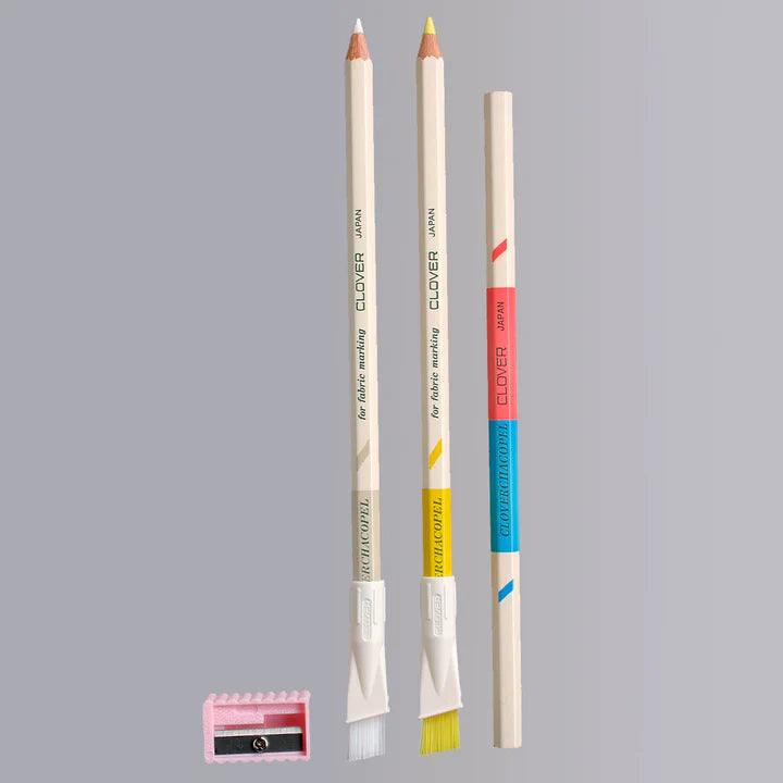PRODUCT DETAILS: :: Clover Chacopel Fine Marking Pencil Set :: Includes 3 pencils in White, Yellow and Blue/Pink Combo Pencil :: Steel Blade Sharpener included :: White & Yellow pencils include brush-style cap to help dust off excess markings :: Re-sharpen the tip with the included pencil sharpener