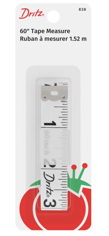 The Dritz 60" tape measure is a versatile tool ideal for sewing, quilting, and DIY projects. It features a flexible, double-sided design that measures both imperial and metric units, making it suitable for various applications. The tape is made from reinforced fiberglass, ensuring durability and accuracy, with markings every 0.125 inches and a metric scale on the reverse side for easy conversions. It is lightweight and easy to read, making it a must-have for any sewing enthusiast.