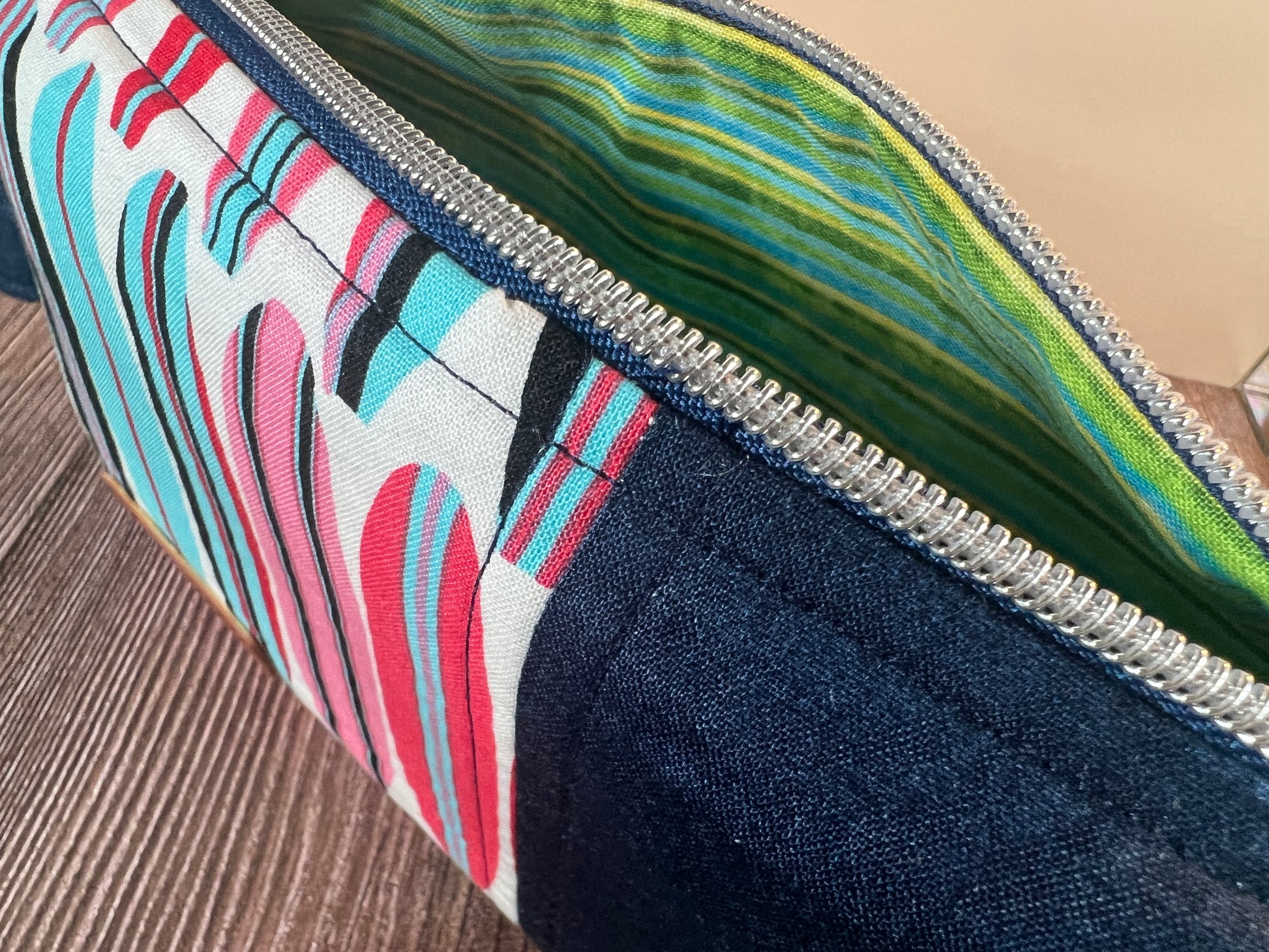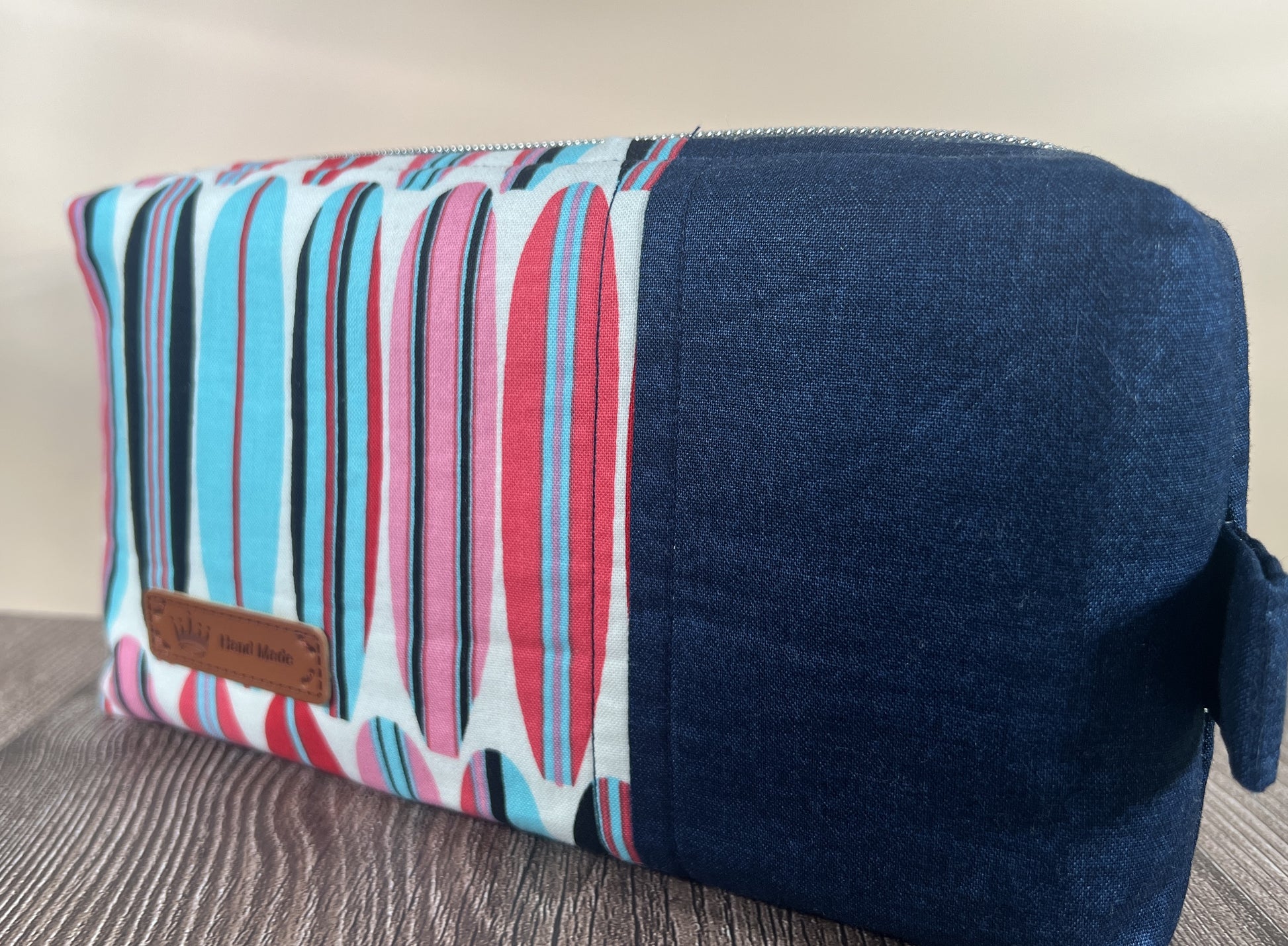 Handmade Structured Box Zipper Bag with Handle | Makeup, Toiletry & Pencil Case In Navy, Blues & Reds
