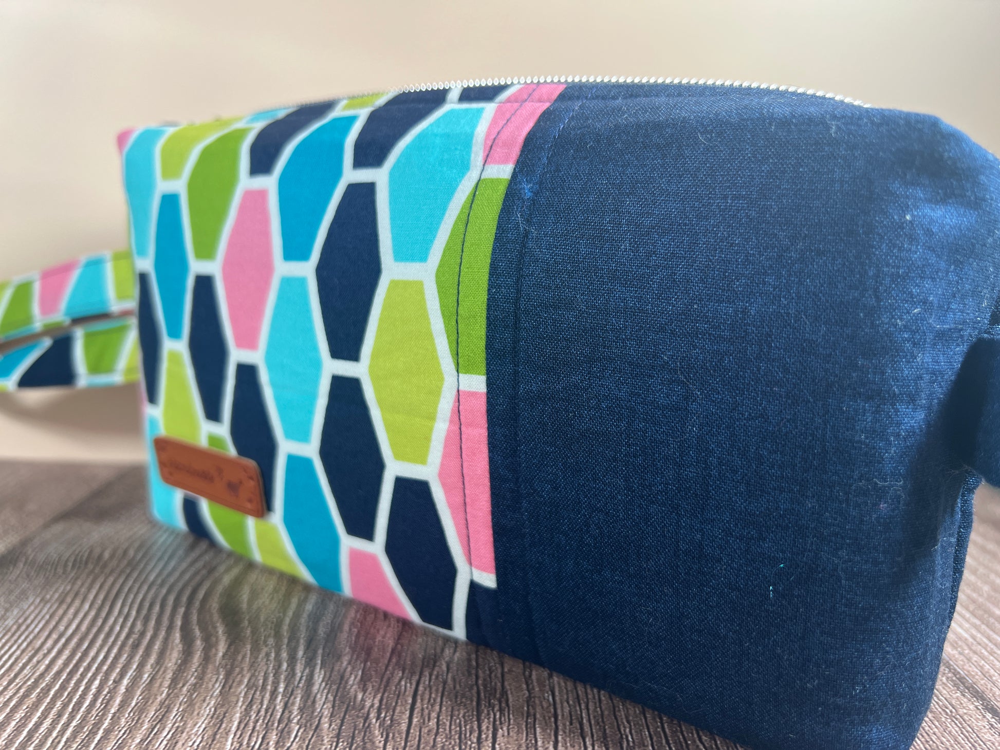 Handmade Structured Box Zipper Bag with Handle | Makeup, Toiletry & Pencil Case In Colourful Tumbling Block
