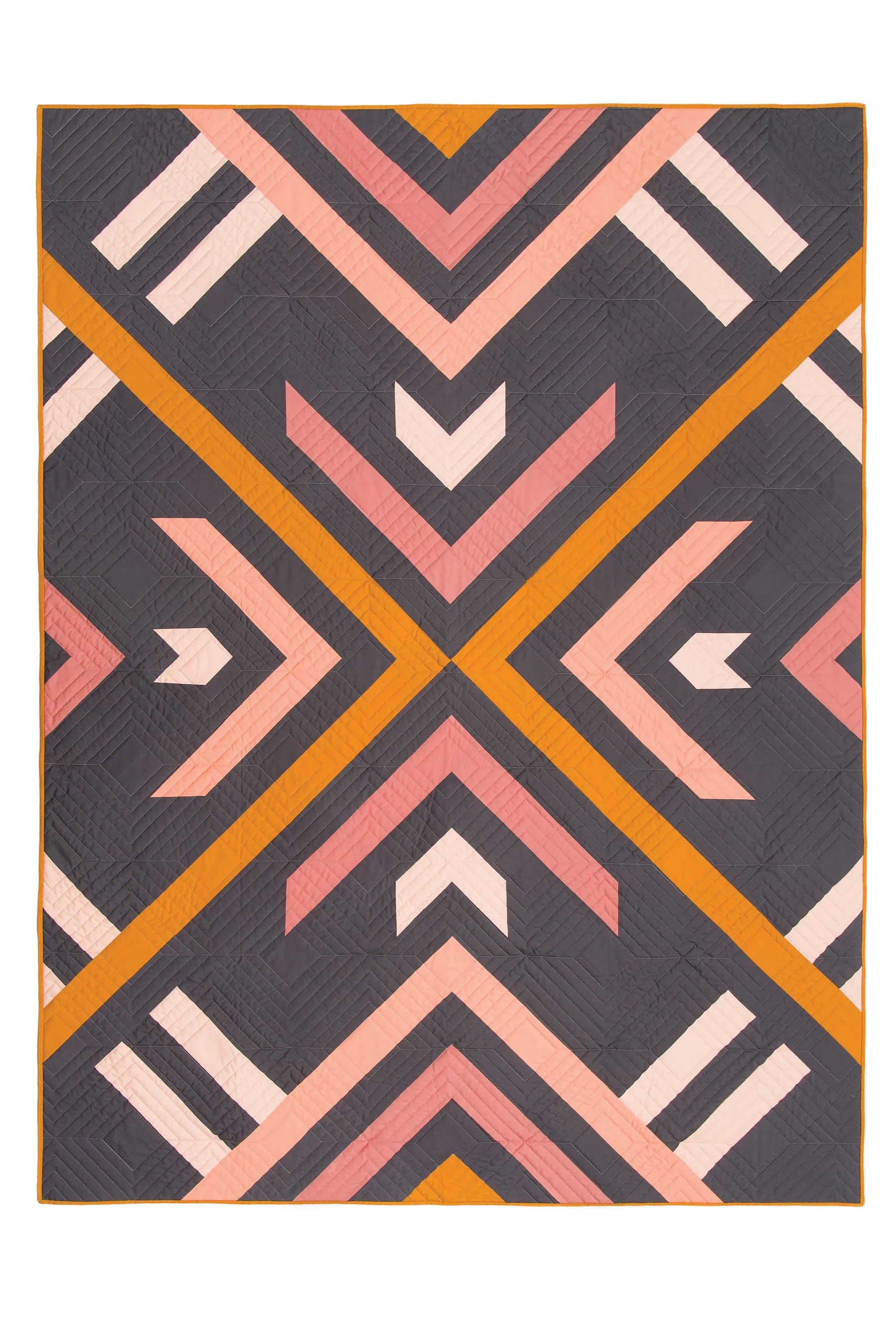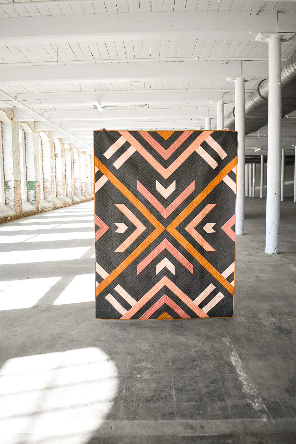 Homecoming is a modern quilt with symmetry and bold shapes with reminders of the comforts of home. After four unexpected and extremely long months of temporary housing, this quilt was all that I could think about. This design symbolizes warmth, comfort and a sense of belonging.