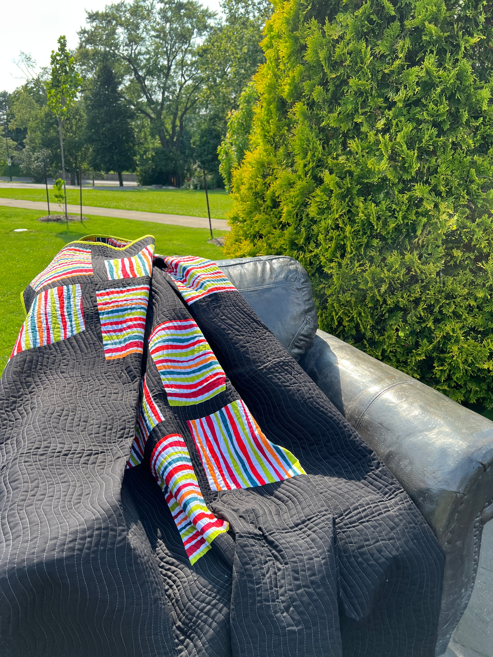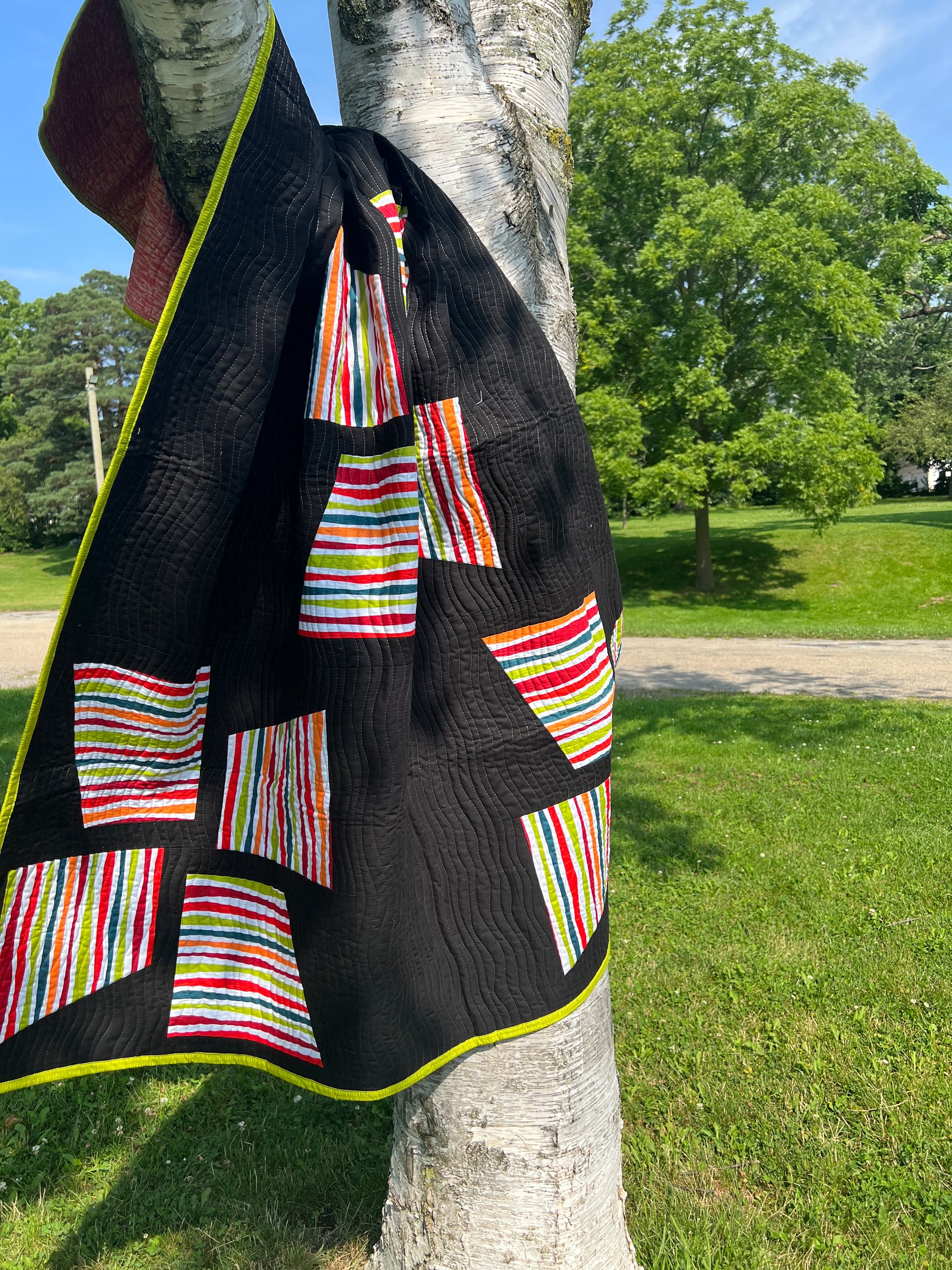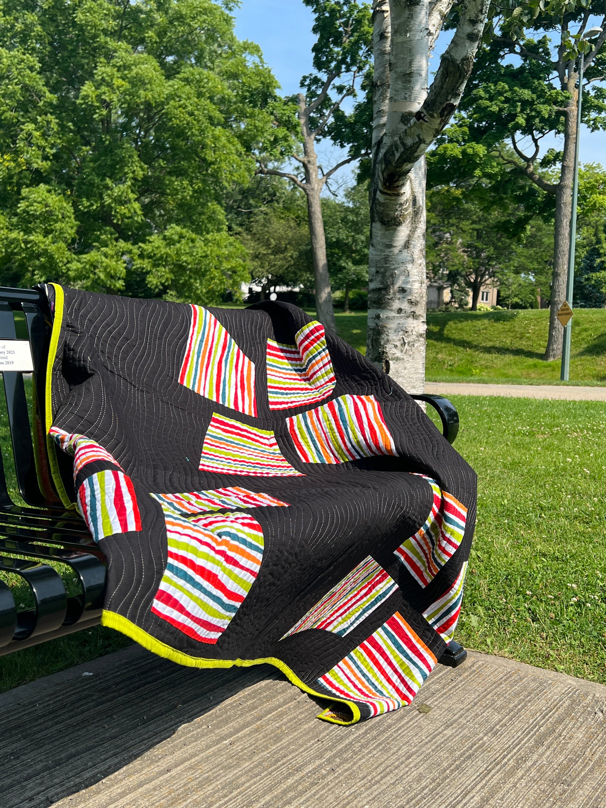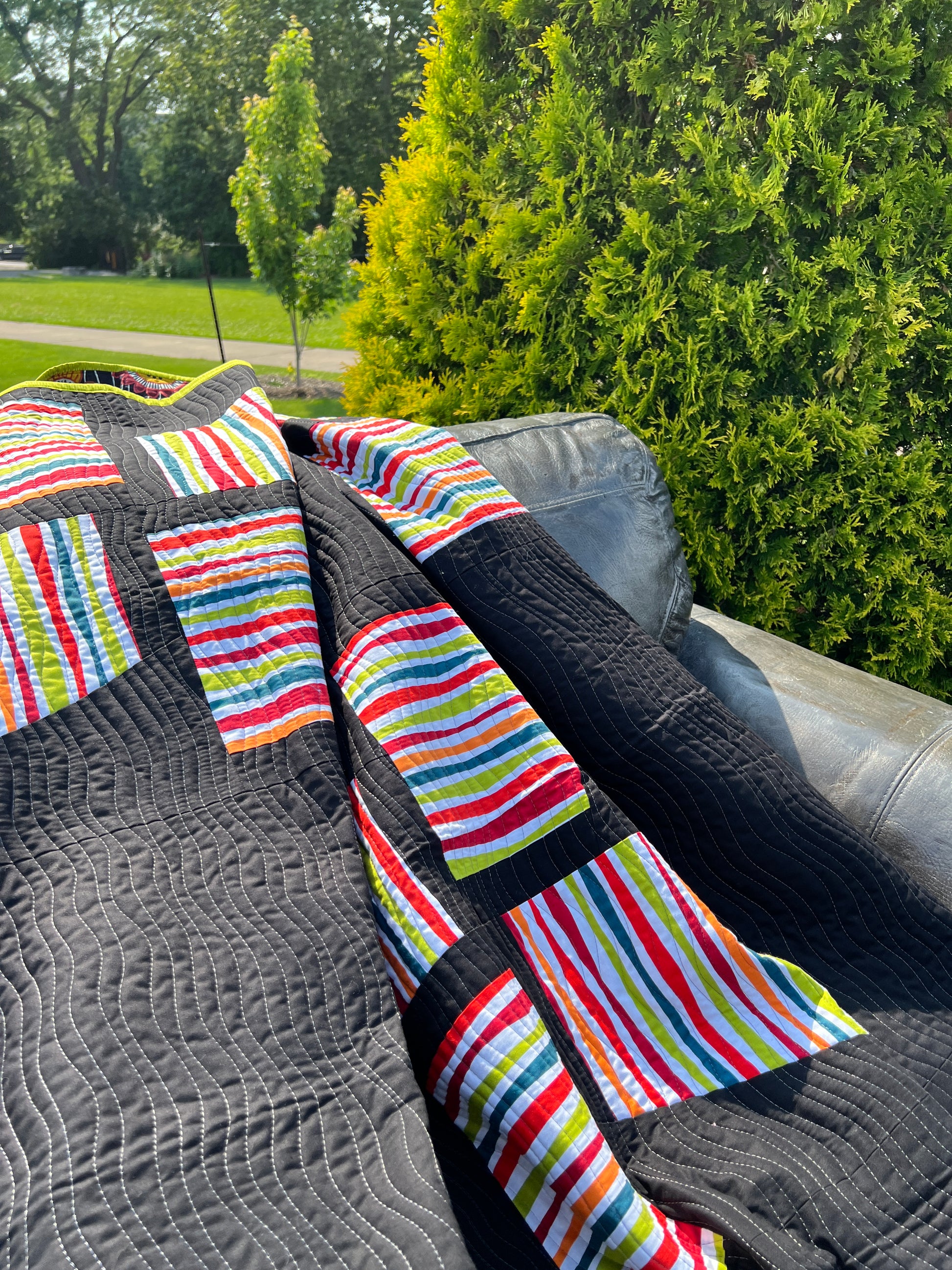Memories of Windmills is a striking custom handmade quilt that brings bold colour and modern design together in one dramatic statement piece. Rich, bright accent colours pop beautifully against a deep black background, creating a quilt that feels contemporary, graphic, and full of movement.