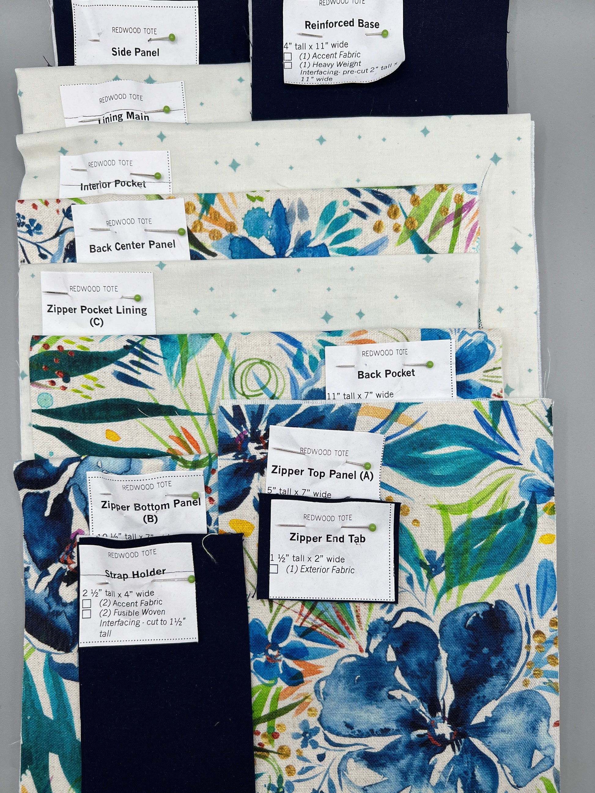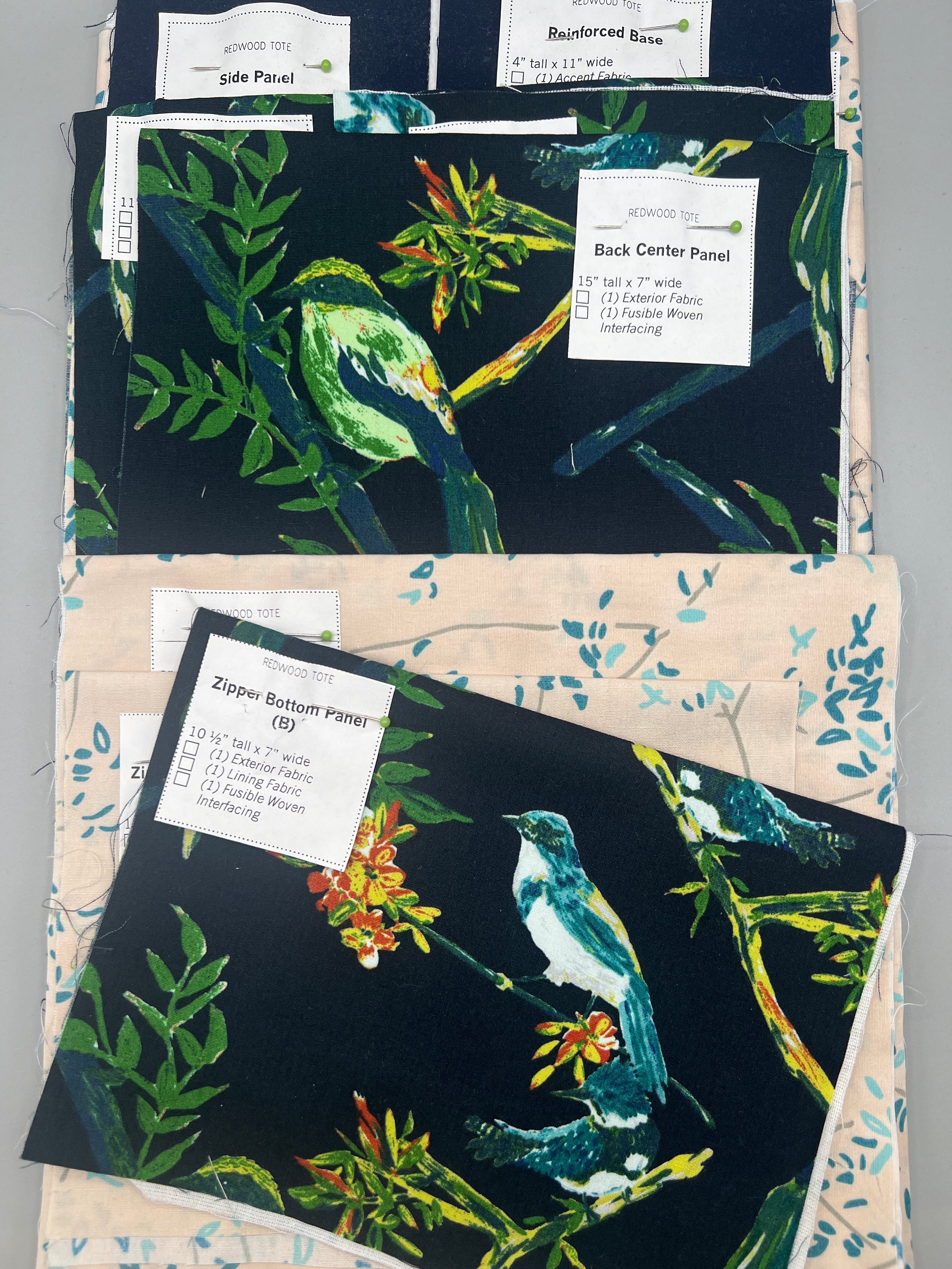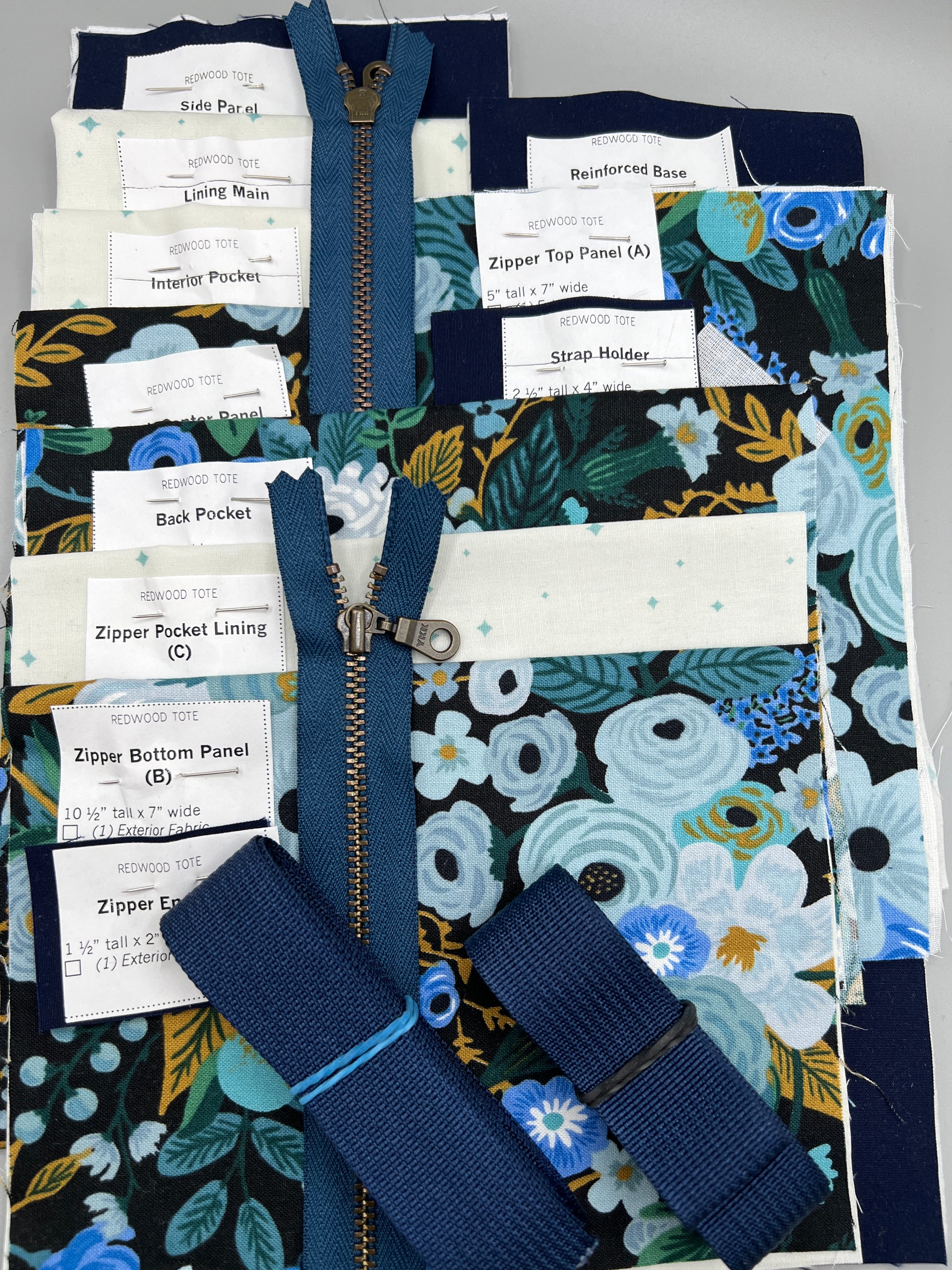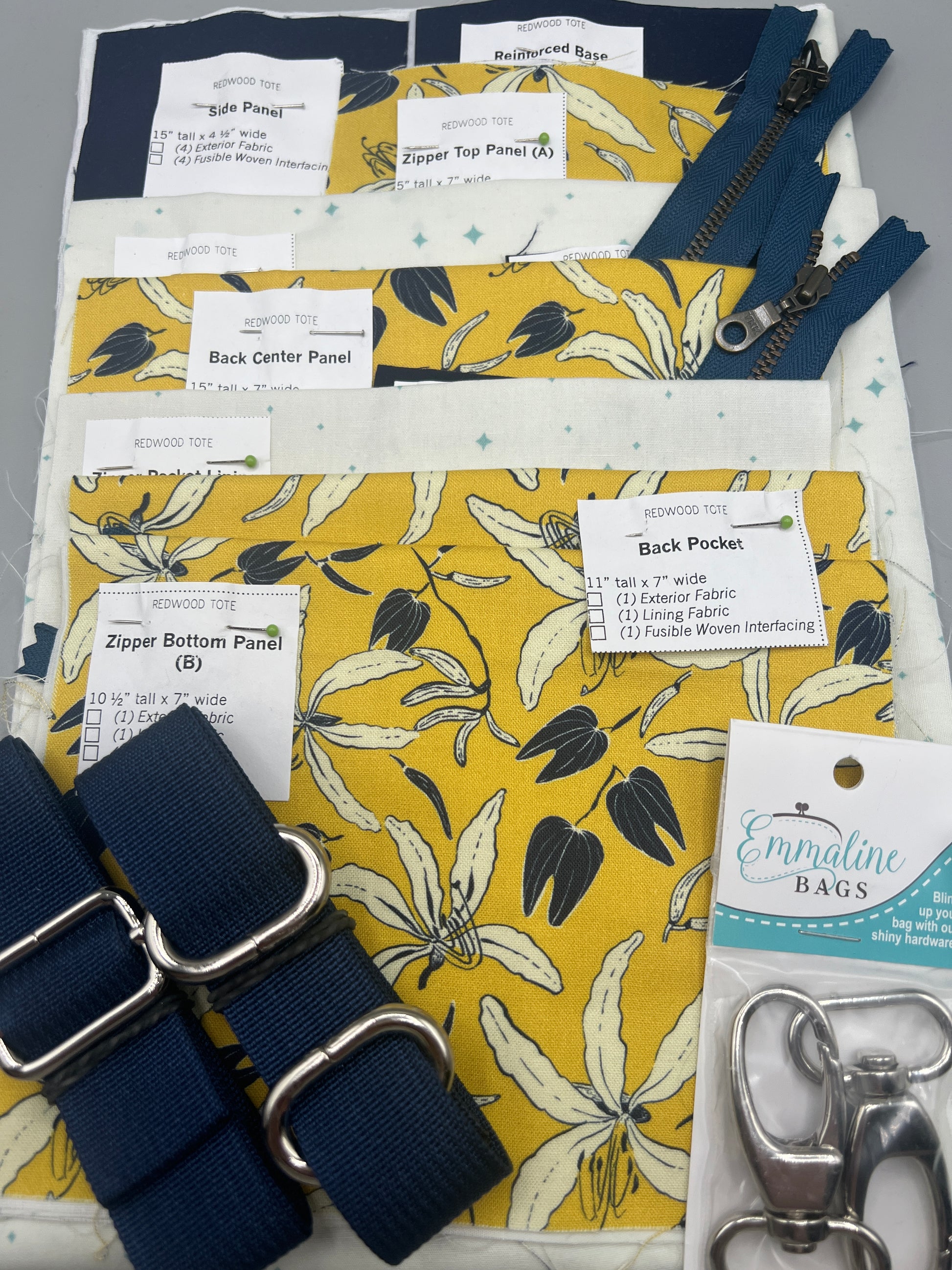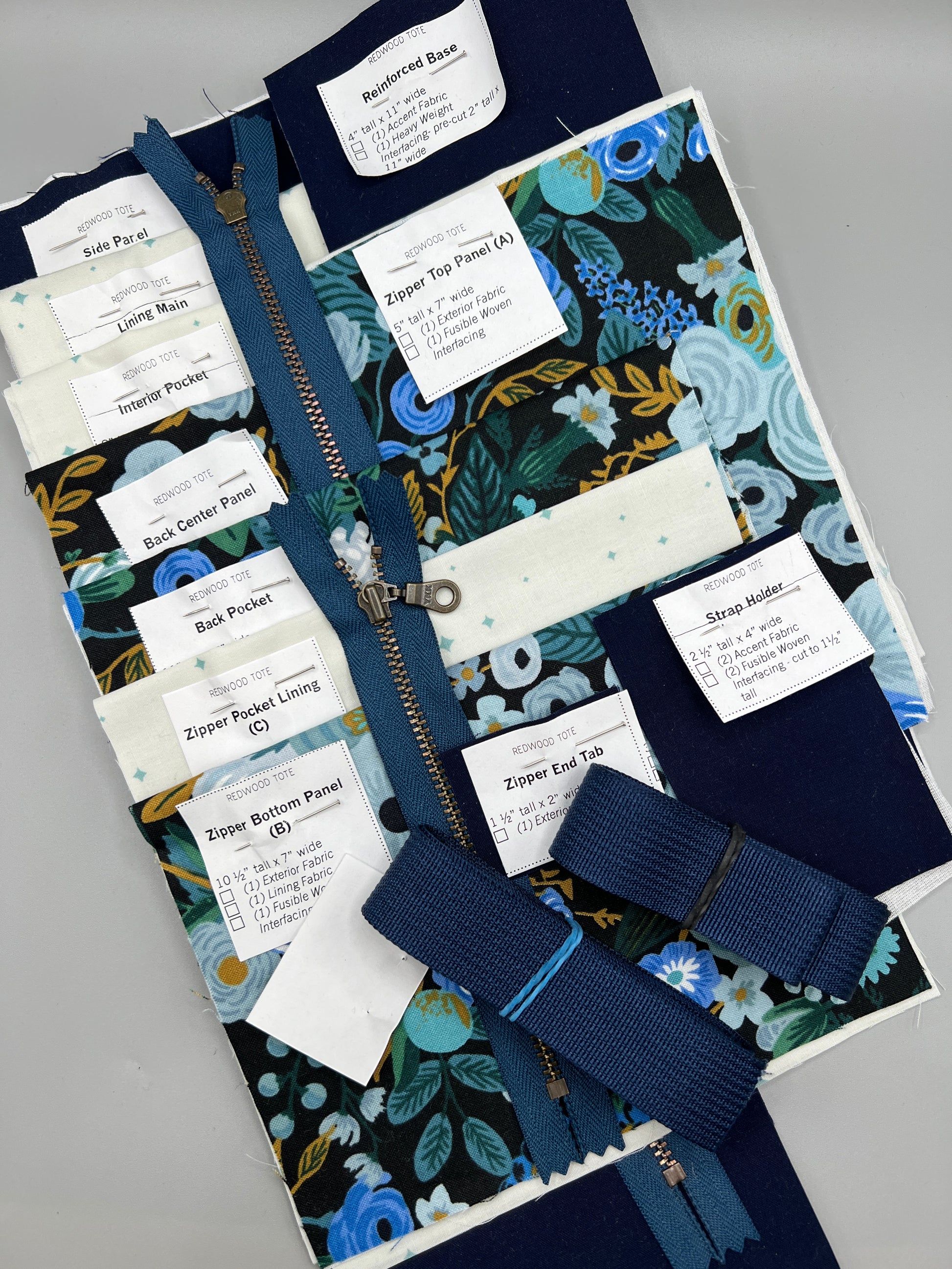The Redwood Tote Complete Pre-Cut Kit includes everything you need to create this beautiful and popular Noodlehead design. The kit featuring the popular Merchant Mills Waxed Canvas in Navy & coordinating Art Gallery or Moda Prints. The kit also included Art Gallery lining fabrics, Fusible interfacing, and all Emmaline Bag hardware and zippers required.