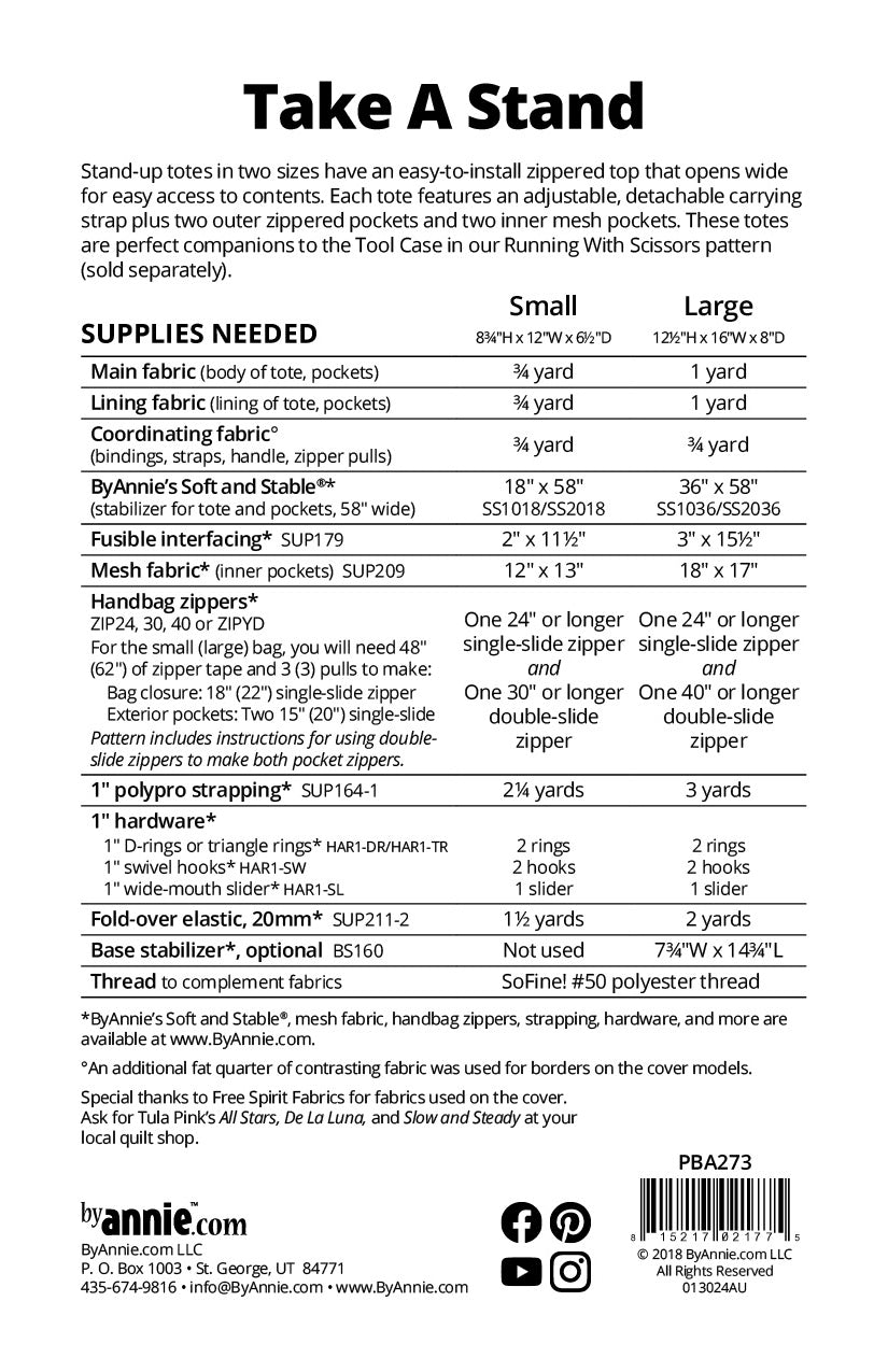 TIP: See also our Running With Scissors pattern, which is a companion to Take A Stand. That pattern includes instructions for a handy zip-up Tool Case to store and carry a plethora of tools, from rotary cutters and scissors to markers, turning tools, small rulers, and more. A variety of easy-to-access pockets in vinyl, mesh, and quilted fabric can be customized to fit the tools you use and love.